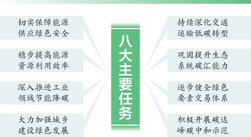 《实施方案》聚焦能源供给、资源利用、工业领域、城乡建设、交通运输、生态碳汇、绿色要素、试点示范8个方面提出具体建设任务。