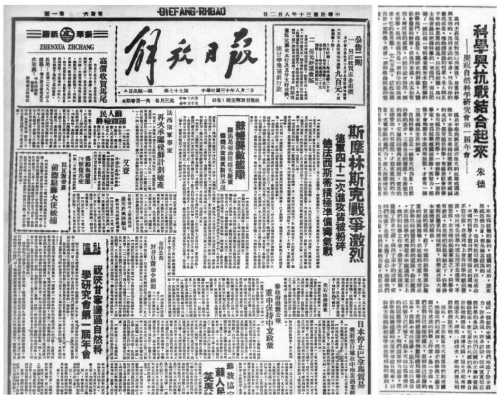 《解放日报》社论《祝陕甘宁边区自然科学研究会第一届年会》,发表于1941年8月2日头版。朱德:《科学与抗战结合起来 庆祝自然科学研究会第一届年会》,发表于1941年8月3日《解放日报》第2版。图源:中国历史文献总库·近代报纸数据库