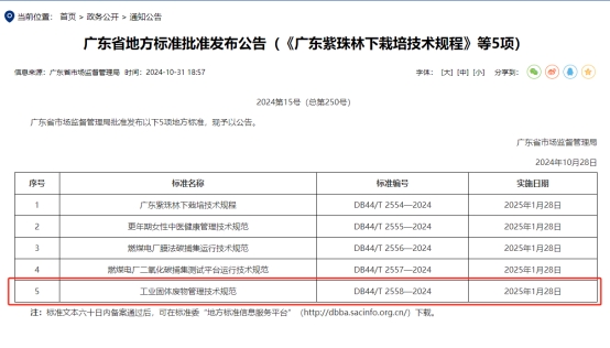 《工业固体废物管理技术规范》省级地方标准发布公告