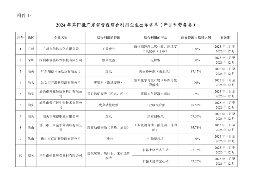 1、2024年第四批广东省资源综合利用企业公示名单(产品和劳务类)