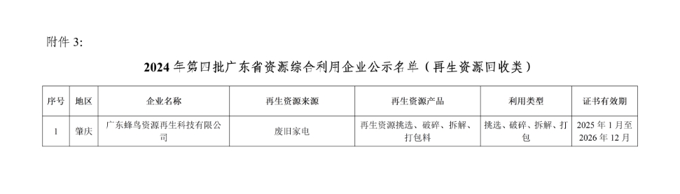 3、2024年第四批广东省资源综合利用企业公示名单(再生资源回收类)