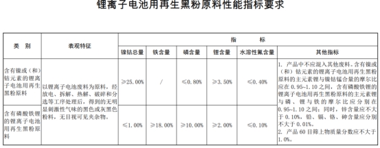 (四)明确锂离子电池用再生黑粉原料、再生钢铁原料的性能指标要求。