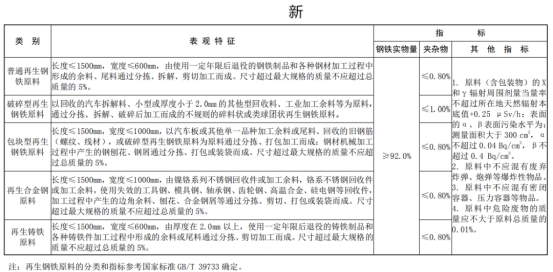 1.将再生钢铁原料类别由原来的七类(重型再生钢铁原料、中型再生钢铁原料、小型再生钢铁原料、破碎型再生钢铁原料、包块型再生钢铁原料、合金钢再生钢铁原料、铸铁再生钢铁原料)调整为五类(普通再生钢铁原料、破碎型再生钢铁原料、包块型再生钢铁原料、再生合金钢原料、再生铸铁原料),将原来的“重型再生钢铁原料”“中型再生钢铁原料”“小型再生钢铁原料”合并为“普通再生钢铁原料”。