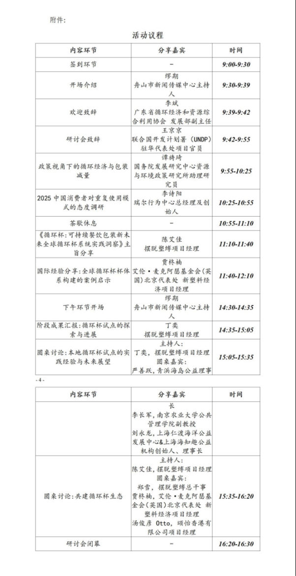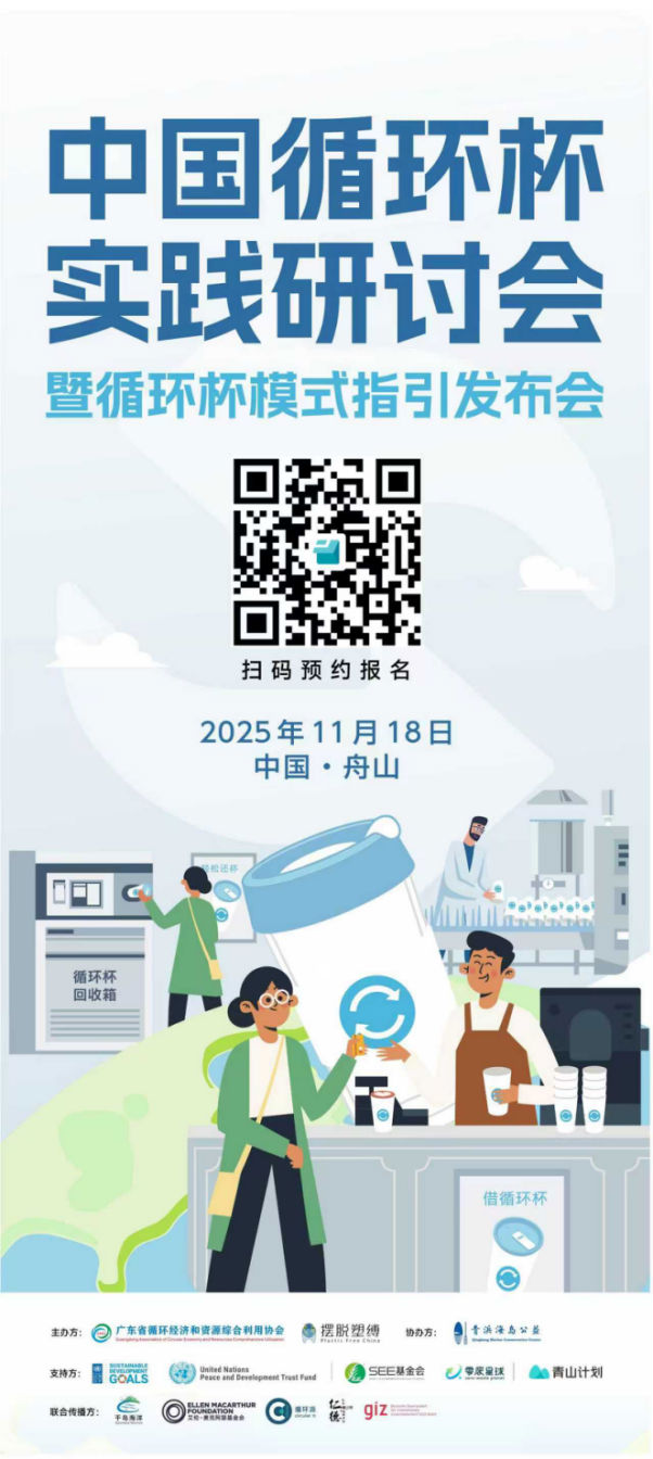 目前,循环杯是减少一次性用品、提升观众体验、推动行业可持续发展的重要解决方案。为深入贯彻落实《2030年前碳达峰行动方案》《“十四五”塑料污染治理行动方案》《关于深入推进快递包装绿色转型的行动方案》和《关于发挥行业协会作用加强塑料污染治理宣传引导工作的通知》的精神和要求,进一步推广循环杯的应用,广东省循环经济和资源综合利用协会联合广州摆脱塑缚环保咨询有限公司拟于2025年11月18日在舟山市举办“中国循环杯实践研讨会暨循环杯模式指引发布会”。具体内容如下: