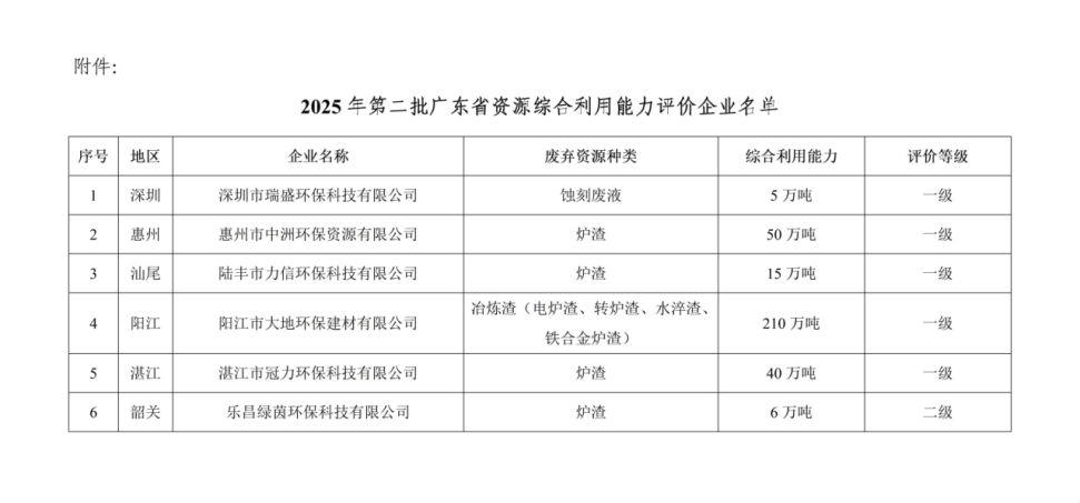 附件:2025年第二批广东省资源综合利用能力评价企业名单